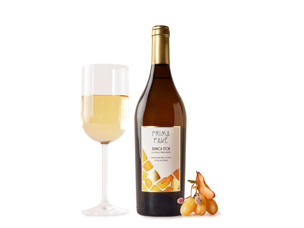 Nealkoholické bílé víno Bianca D’Or z Friuli. Druhy peckového ovoce, liči a květinové tóny, hedvábná textura, suchý závěr. Stříbrná medaile.